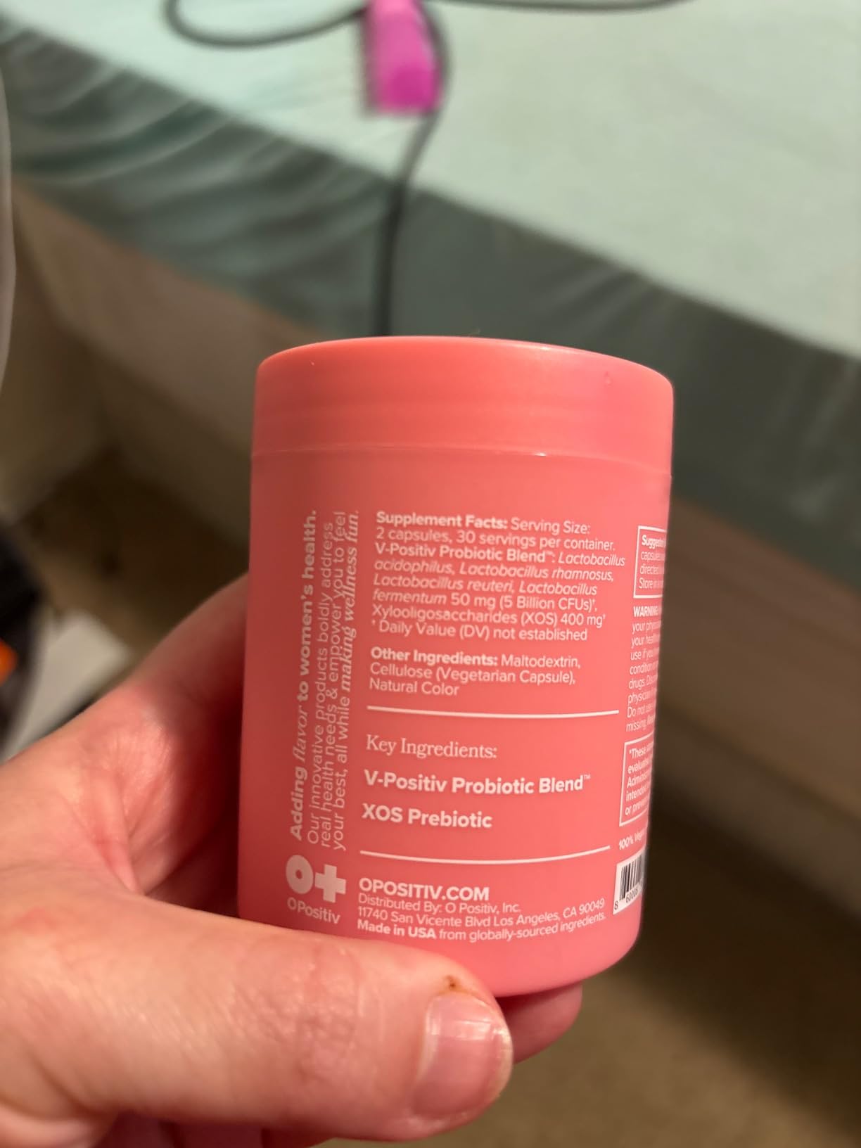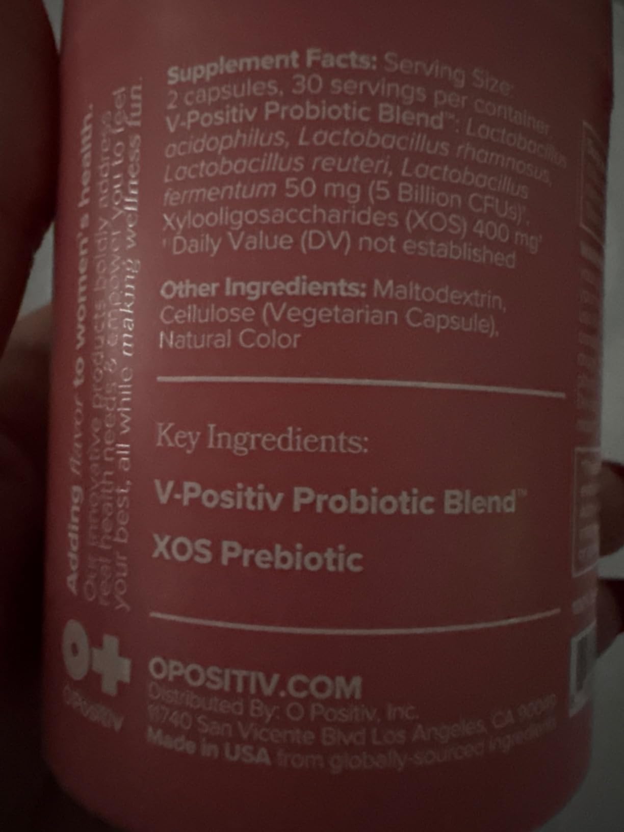 Serving Size: 2 capsules, 30 servings per container. V-Positiv Probiotic Blend™: Lactobacillus acidophilus, Lactobacillus rhamnosus, Lactobacillus reuteri, Lactobacillus fermentum 50 mg (5 Billion CFUs), Xylooligosaccharides (XOS) 400 mg